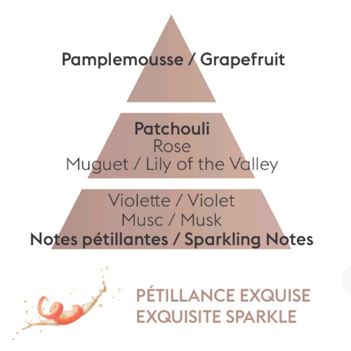 Dès l’ouverture, un zeste de pamplemousse vif et pétillant apporte une fraîcheur éclatante. Le cœur dévoile ensuite un bouquet floral élégant et gourmand mêlant rose, muguet et patchouli, avant de s’épanouir sur un fond fruité et délicat où violette, musc et notes de champagne prolongent la sensation de fête.